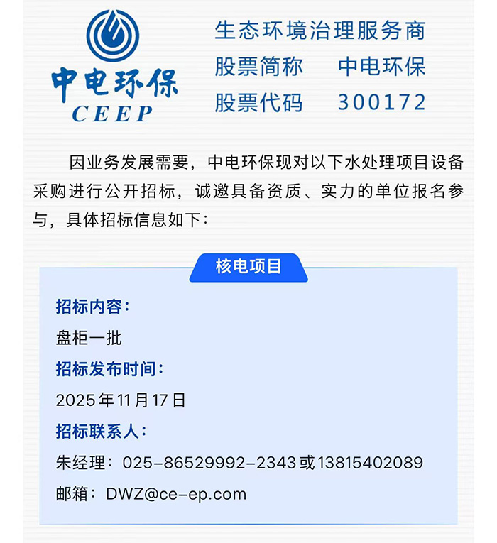 中电环保股份有限公司是南京市首家环保上市公司(股票简称:中电环保,股票代码:300172),南京环保产业协会会长单位,国家级联盟理事长单位,是生态环境治理服务商,主营(3+1):水务、固危废、烟气治理及产业创新平台,包括:工业水处理、污水处理及水环境综合治理;固危废土壤、污泥餐厨垃圾处理;烟气及VOCS治理;智慧环保;高端装备等。