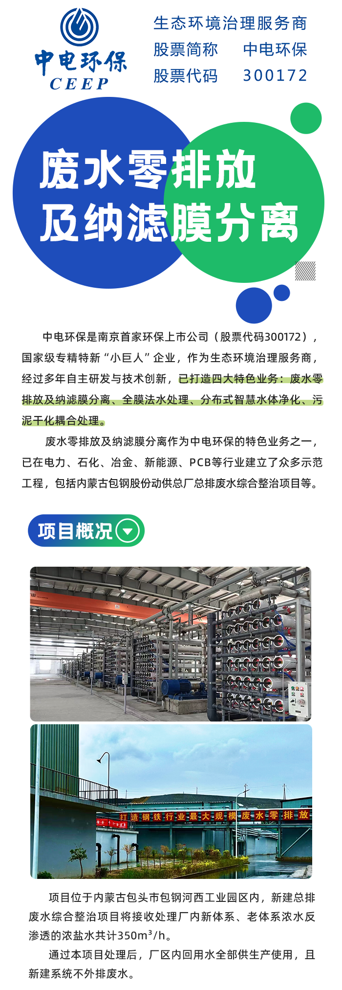 中电环保股份有限公司是南京市首家环保上市公司(股票简称:中电环保,股票代码:300172),南京环保产业协会会长单位,国家级联盟理事长单位,是生态环境治理服务商,主营(3+1):水务、固危废、烟气治理及产业创新平台,包括:工业水处理、污水处理及水环境综合治理;固危废土壤、污泥餐厨垃圾处理;烟气及VOCS治理;智慧环保;高端装备等。