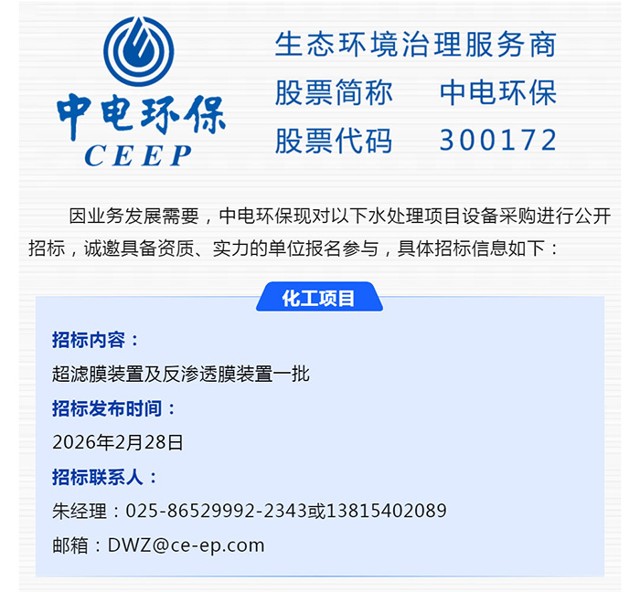 中电环保股份有限公司是南京市首家环保上市公司(股票简称:中电环保,股票代码:300172),南京环保产业协会会长单位,国家级联盟理事长单位,是生态环境治理服务商,主营(3+1):水务、固危废、烟气治理及产业创新平台,包括:工业水处理、污水处理及水环境综合治理;固危废土壤、污泥餐厨垃圾处理;烟气及VOCS治理;智慧环保;高端装备等。